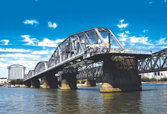 鴨綠江斷橋?yàn)轼喚G江上諸多橋中第一座橋,由日本朝鮮總督府鐵道局所建。1909年5月動(dòng)工,1911年10月竣工。1950年11月,被美國(guó)空軍炸斷。戰(zhàn)后中方一側(cè)所剩四孔殘橋一直保留,被習(xí)慣上稱為“斷橋”,朝方一側(cè)則把所屬六孔和中方剩余兩孔殘橋拆除,僅存橋墩。