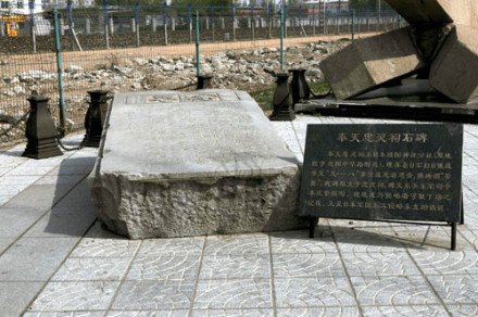 奉天忠靈祠石碑:日本帝國主義先后在沈陽建立了“日俄奉天大會(huì)戰(zhàn)紀(jì)念碑”和“靖國神社奉天分社忠靈祠、忠靈塔、忠靈碑”,用來埋葬侵華日軍在日俄戰(zhàn)爭至“九·一八”事變期間戰(zhàn)死者的36400多個(gè)將士的遺骨。