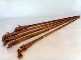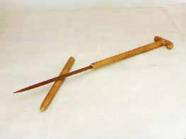 拐杖刀:俗稱“二人奪”,長約90厘米。表面上看呈拐杖型,木質(zhì)。但實(shí)際上,其前面是可以斷開的,拔出外鞘,里面是一個(gè)刺刀。這是抗日斗爭初期,東滿游擊隊(duì)和當(dāng)?shù)厝罕娪脕韺Ω稊橙说拿孛芪淦。是?dāng)時(shí)很流行很實(shí)用的武器。