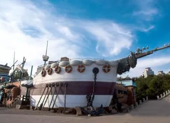 海盜村以海盜和海盜景物的卡通造型,對所有建筑,游樂設施、休閑場所,景觀進行包裝。一期工程中的海盜船,是國內(nèi)僅有的架設在海灣海平面上的海盜船。它的支點高13.5米,最大擺角120度,每船可以乘游客40人。