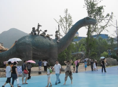 侏羅紀激流探險,總占地面積8600平方米,以一種時空穿插的景觀設計手法,將五種八只侏羅紀時期的恐龍置身于虛幻的遠古村落中。載客古船,沿210米長,15米高的水道激流急下,沿途中,一只高9米,長19.8米,重約8噸的亞洲最大的機械恐龍“巨無霸”,不時的向沖刺在激流中的游人搖頭擺尾,吼叫或噴水,載客古船激起的25米高的巨浪。 旅游船