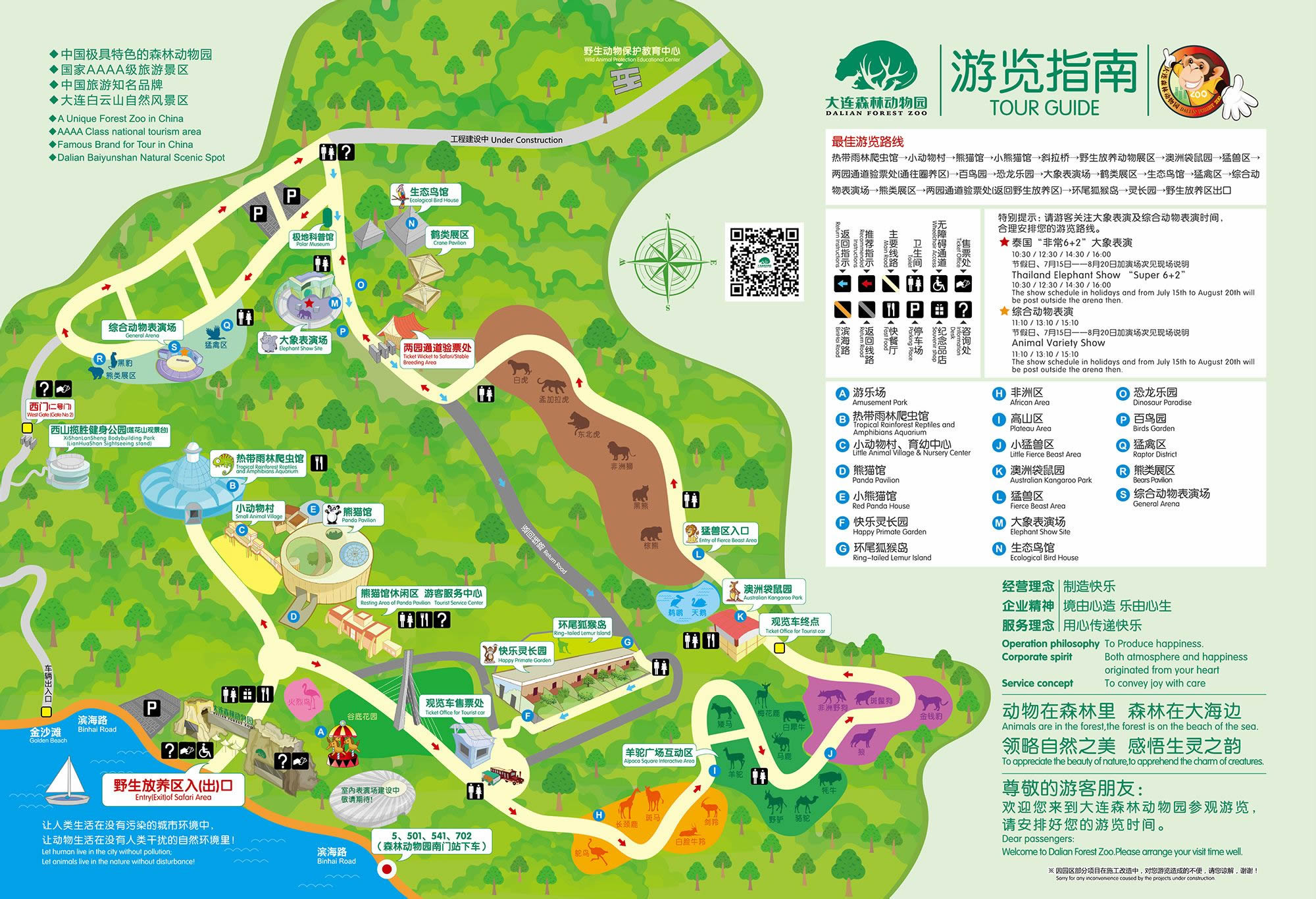 大連森林動物園在動物品種上主要突出新、奇、特;在動物種群上主要突出少而精;在展養(yǎng)方式上以圈養(yǎng)和散養(yǎng)為主,突出熱門主題展示、注重"全天候"及人與動物的交流;在環(huán)境處理上以自然風(fēng)光為主,形成自然景觀與人文景觀有機(jī)結(jié)合。