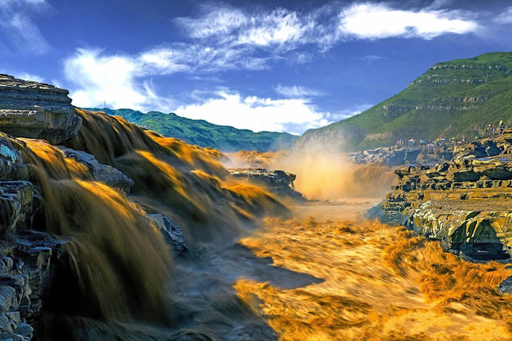 黃河壺口瀑布旅游區(qū)是國(guó)家級(jí)風(fēng)景名勝區(qū),東瀕山西省臨汾市吉縣壺口鎮(zhèn),西臨陜西省延安市宜川縣壺口鎮(zhèn),為兩省共有旅游景區(qū)。南距陜西省西安市350千米;北距山西省太原市387千米。壺口瀑布是中國(guó)第二大瀑布,世界上最大的黃色瀑布。黃河奔流至此,兩岸石壁峭立,河口收束狹如壺口,故名壺口瀑布。瀑布上游黃河水面寬300米,在不到500米長(zhǎng)距離內(nèi),被壓縮到20—30米的寬度。1000立方米/秒的河水,從20多米高的陡崖上傾注而瀉,形成“千里黃河一壺收”的氣概。