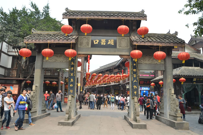 磁器口古鎮(zhèn),原名白巖場,也稱龍隱鎮(zhèn),地處重慶市沙坪壩區(qū)東北部,嘉陵江畔磁南街1號(hào)。北距沙坪壩中心5千米,重慶市中心14千米,南距石井坡3千米。古鎮(zhèn)總面積32.5萬平方米,景區(qū)核心面積分布于馬鞍山東側(cè)和東南側(cè),有14.3萬平方米。磁器口古鎮(zhèn),始建于宋真宗咸平年間,在清朝及民國時(shí)期得到飛速發(fā)展;1958年后,隨著水運(yùn)交通逐漸蕭條,古鎮(zhèn)日漸衰落;20世紀(jì)末,憑借古鎮(zhèn)旅游潮流,磁器口古鎮(zhèn)又再次得到發(fā)展。它是重慶主城區(qū)內(nèi)唯一的規(guī)模最大、最具巴渝傳統(tǒng)民居、民俗、民風(fēng)特色的古鎮(zhèn)。古鎮(zhèn)上傳統(tǒng)的民居建筑、石梯街巷、遺存的寺廟宮觀,是巴渝山地民居建筑的天然博物館。磁器口古鎮(zhèn)依山而建,由山起城。以磁器口正街和橫街為骨架,42條巷道垂直于正街和橫街向馬鞍山脊和溪溝邊緣呈枝狀發(fā)展,形成特征明顯的樹枝狀平面格局。古鎮(zhèn)的主要景點(diǎn)有翰林院、鐘家院、寶善宮、寶輪寺、黃桷坪牌坊等。
