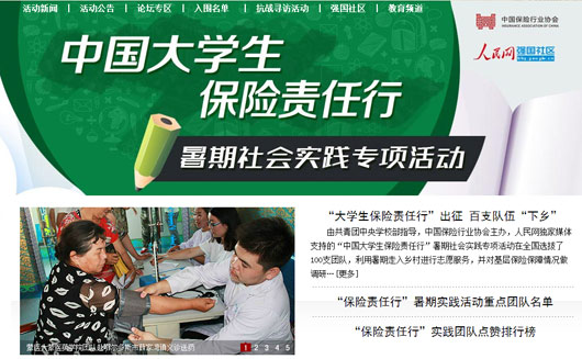 本次活動(dòng)從全國(guó)27個(gè)省市100多所高校選拔出100支入圍團(tuán)隊(duì),在暑期分別以支教、環(huán)保、醫(yī)療、調(diào)研等形式服務(wù)鄉(xiāng)村,提高當(dāng)?shù)鼐用癜踩庾R(shí),提升社會(huì)對(duì)安全教育問(wèn)題的關(guān)注,同時(shí)開(kāi)展調(diào)研,了解基層保險(xiǎn)保障相關(guān)情況。各團(tuán)隊(duì)實(shí)踐期間在人民網(wǎng)強(qiáng)國(guó)社區(qū)活動(dòng)專(zhuān)區(qū)實(shí)時(shí)播報(bào)實(shí)踐進(jìn)程,發(fā)回稿件數(shù)千篇。大學(xué)生們積極走入社會(huì)、服務(wù)基層的實(shí)際行動(dòng)贏得50萬(wàn)網(wǎng)友為他們“點(diǎn)贊”。