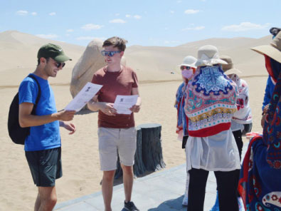 在敦煌的鳴沙山與月牙泉,兩名英國劍橋大學(xué)的大學(xué)生對“一帶一路”和“絲綢之路”概念的熟知程度令團隊成員十分驚訝,外國青年對中國的文化歷史的濃厚興趣也令交流采訪十分順利和有趣。