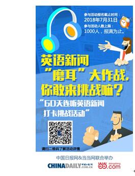 2018這個夏天,中國日報網(wǎng)攜手當(dāng)當(dāng)網(wǎng)推出首期“60天連聽英語新聞打卡達(dá)人活動”,你不僅能通過中國日報網(wǎng)外籍專家的純正英音、美音了解每天世界上的精彩趣聞,還可以考驗自己的毅力和自律性。60個工作日,三個月的時間,看似很短,但是你的努力,時間看得到!跟上我們這60天的步伐,相信您的英語能力會日益精進(jìn)。