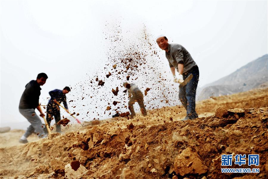 甘肅臨夏回族自治州駐村扶貧干部在幫助農(nóng)民平地種樹。(新華社)