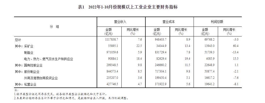 國(guó)家統(tǒng)計(jì)局?jǐn)?shù)據(jù)顯示,今年前10個(gè)月,全國(guó)規(guī)模以上工業(yè)企業(yè)營(yíng)業(yè)收入同比增長(zhǎng)7.6%,利潤(rùn)同比下降3%。國(guó)家統(tǒng)計(jì)局工業(yè)司高級(jí)統(tǒng)計(jì)師朱虹解讀工業(yè)企業(yè)利潤(rùn)數(shù)據(jù)時(shí)表示,總體看,工業(yè)企業(yè)利潤(rùn)下降,結(jié)構(gòu)繼續(xù)改善,部分中下游行業(yè)利潤(rùn)回升明顯。但也要看到,近期國(guó)內(nèi)疫情散發(fā)多發(fā),世界經(jīng)濟(jì)衰退風(fēng)險(xiǎn)加劇,工業(yè)企業(yè)效益恢復(fù)面臨較大壓力。