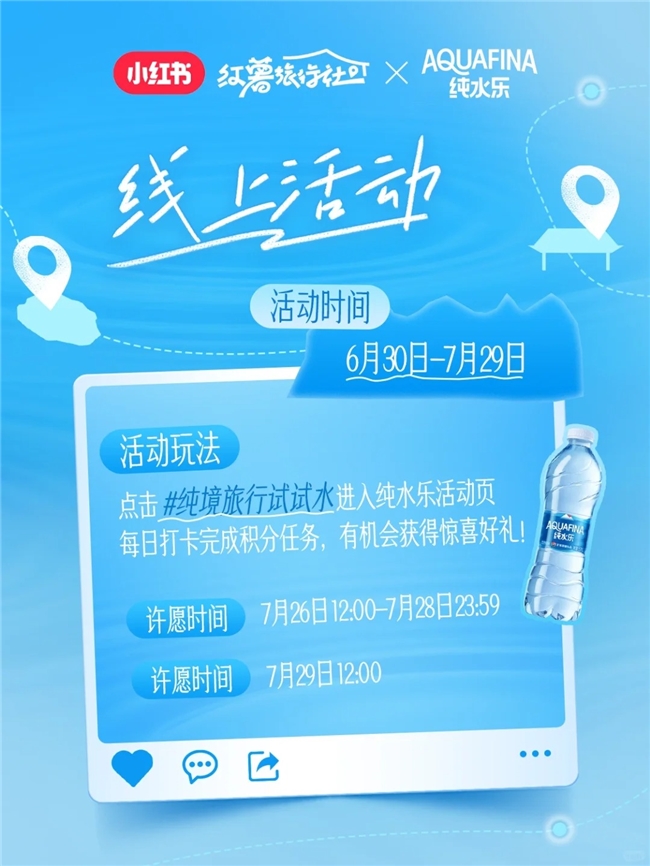 貼合旅行魅力,一場(chǎng)線上線下聯(lián)動(dòng)的全新旅行玩法就此展開(kāi)。@AQUAFINA純水樂(lè) 官方賬號(hào)在小紅書(shū)發(fā)布游玩號(hào)召視頻官宣活動(dòng),分享這場(chǎng)“水是純凈的,心是自由的”旅行概念。小紅書(shū)@好好玩情報(bào)局 承接活動(dòng)外放,介紹線上線下活動(dòng)玩法,正式開(kāi)啟為期一個(gè)月的攢積分任務(wù)限時(shí)許愿贏好禮活動(dòng),以趣味性互動(dòng)玩法、豐厚的獎(jiǎng)勵(lì)機(jī)制吸引用戶主動(dòng)關(guān)鍵詞搜索、品牌筆記瀏覽、品牌主頁(yè)關(guān)注、分享品牌信息,助力純水樂(lè)品牌成功將流量變?yōu)榱?ldquo;留量”。