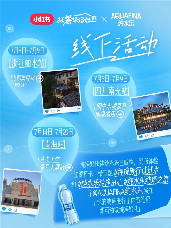 在三位“先鋒試水官”的帶動(dòng)下,四川南充、浙江麗水、青海三大純境路線被更多用戶關(guān)注。純水樂(lè)也協(xié)同小紅書(shū)在三大純境路線合作的民宿酒店設(shè)置線上線下聯(lián)動(dòng)新玩法。7月3日-7月9日,浙江麗水站飛蔦集民宿(松陽(yáng)店)、四川南充站閬中水城嘉舟麗港酒店線下互動(dòng)贏好禮活動(dòng)率先啟動(dòng),位于青海的茶卡天空壹號(hào)大酒店7月14日-7月20日也很快解鎖加入該活動(dòng)。
