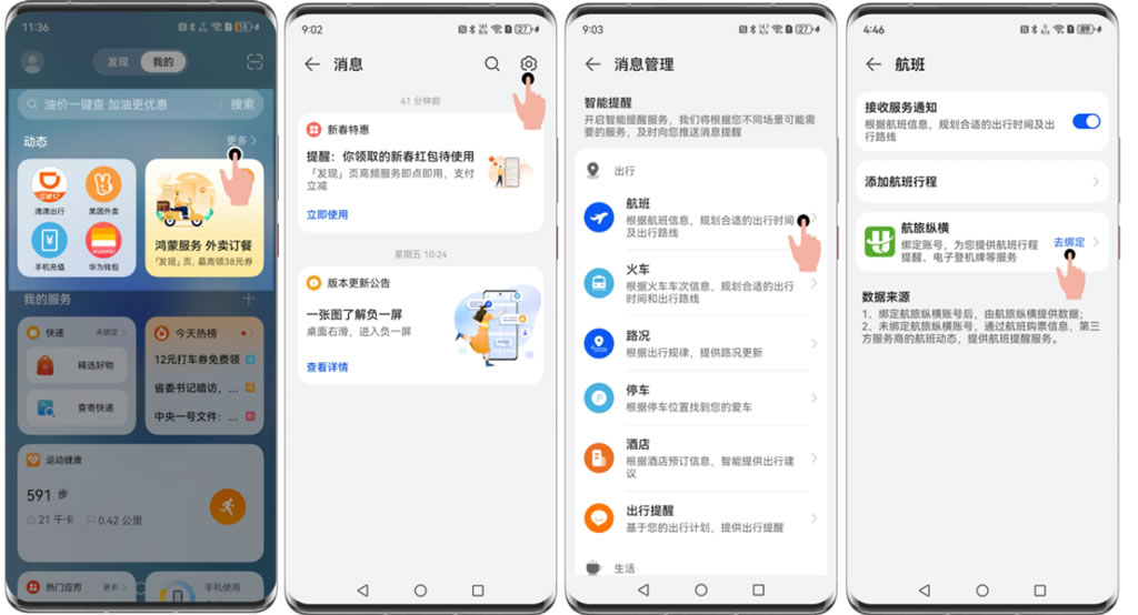 除了上面介紹的三個主要功能之外,華為手機的實用功能還有很多,比如華為Pura 70系列、Mate 60系列等機型只需要喚醒智慧助手小藝,就可以讓它根據(jù)目的地等條件編寫一篇使用的旅游攻略。甚至智慧識別判斷用戶是否需要出行服務(wù),并通過卡片實時顯示高鐵、航班或者打車信息。通過手機負(fù)一屏,右劃一下,也可以很方便的調(diào)用“航旅縱橫”值機,或者“鐵路12306”乘坐高鐵。