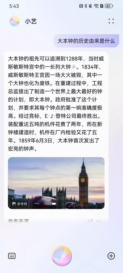 旅行途中遇到任何問題,都可以向華為手機“問一問”。借助強大的AI技術底座,華為智慧助手小藝能夠理解你的需求,并提供精準的答案和建議。例如,當你漫步在倫敦街頭,被雄偉的大本鐘所震撼,卻對它的歷史一無所知時,只需對著手機問小藝:“大本鐘的歷史由來是什么?”,小藝就能為你娓娓道來它的前世今生,讓你對這座城市的歷史文化有更深入的了解。 或者,當你站在巴黎圣母院前,想要了解這座哥特式建筑的藝術風格,也可以向小藝提問,它會為你詳細介紹圣母院的建筑特點和歷史意義。