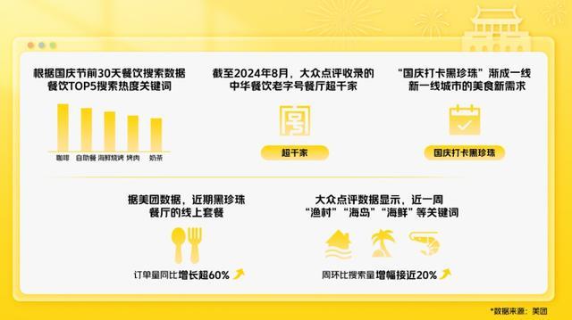 “國慶打卡黑珍珠”漸成一線、新一線城市的美食新需求。據(jù)美團(tuán)數(shù)據(jù)顯示,近期黑珍珠餐廳的線上套餐訂單量同比增長超60%,深圳、福州、廣州地區(qū)提前一周預(yù)訂國慶假期黑珍珠餐廳座位的訂單量同比去年增長均超過2倍,南京、無錫增幅緊隨其后。數(shù)據(jù)顯示,20-30歲的消費者旅行時更喜歡打卡美食市集,為此一些城市還聯(lián)合平臺線上線下打造美食市集等消費新業(yè)態(tài)。