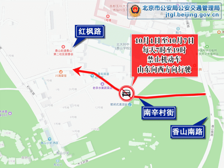 10月1日至10月7日,每天7時至19時,海淀區(qū)南辛村街(紅楓路至香山南路段)禁止機(jī)動車由東向西方向行駛。
