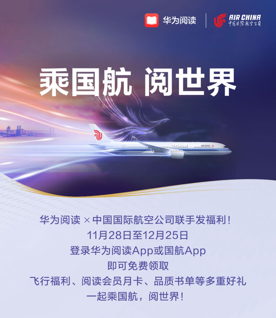 為了豐富旅客的飛行時光,近日華為閱讀與中國國際航空公司攜手,正式啟動了“乘國航 閱世界”國航伴讀計劃,該計劃通過整合華為閱讀的豐富資源與國航的全球航線網(wǎng)絡(luò),為用戶打造一個旅行中的高品質(zhì)閱讀空間。參與此次活動的用戶將可免費領(lǐng)取3重好禮!包含了國航用戶多重福利、30天華為閱讀會員、精選國航伴讀書單,帶旅客悅享旅途的美好。
