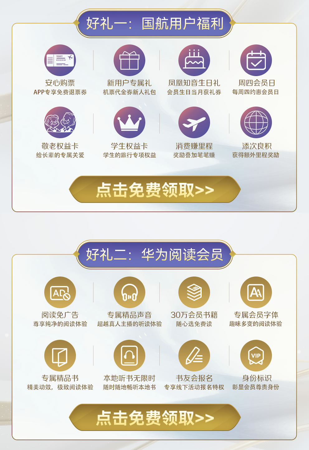 本次活動中,國航為用戶提供了退票券、生日禮、敬老權(quán)益卡、學(xué)生權(quán)益、新人專屬禮券等一系列大禮包。華為閱讀則為國航的用戶提供了30天閱讀會員的專屬福利!領(lǐng)取后可以享受超百家知名出版社30萬冊版權(quán)會員書籍免費讀,不僅可以免費使用專屬會員字體閱讀,還能獲得免廣告的純凈體驗。同時,喜愛聽書的用戶還可以使用專屬的精品聲音聽書,本地聽書無限時,加入書架的書籍還內(nèi)置了專屬精品聲音,給用戶帶來超越真人主播的聽讀體驗。華為閱讀還會定期組織線下書友會,領(lǐng)取會員后可專享書友會優(yōu)先報名特權(quán)!