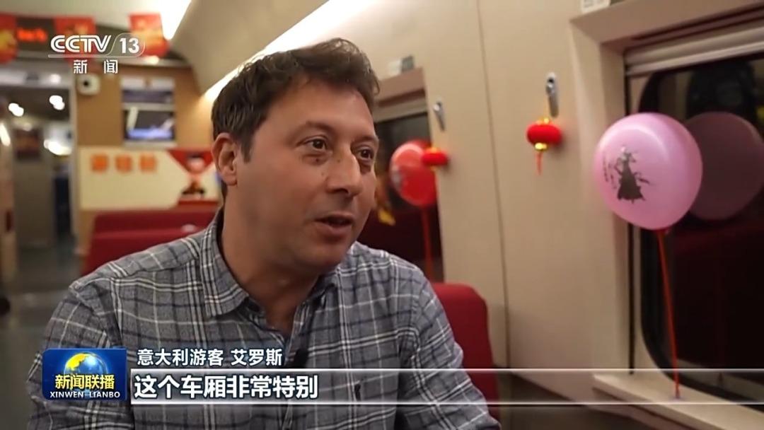 意大利游客 艾羅斯:這個車廂非常特別,我們知道這段時間哪吒的話題非常流行,大家都很喜歡這部電影。在體驗中國高鐵速度的同時,這也是一種很好的旅行方式,這非常好。