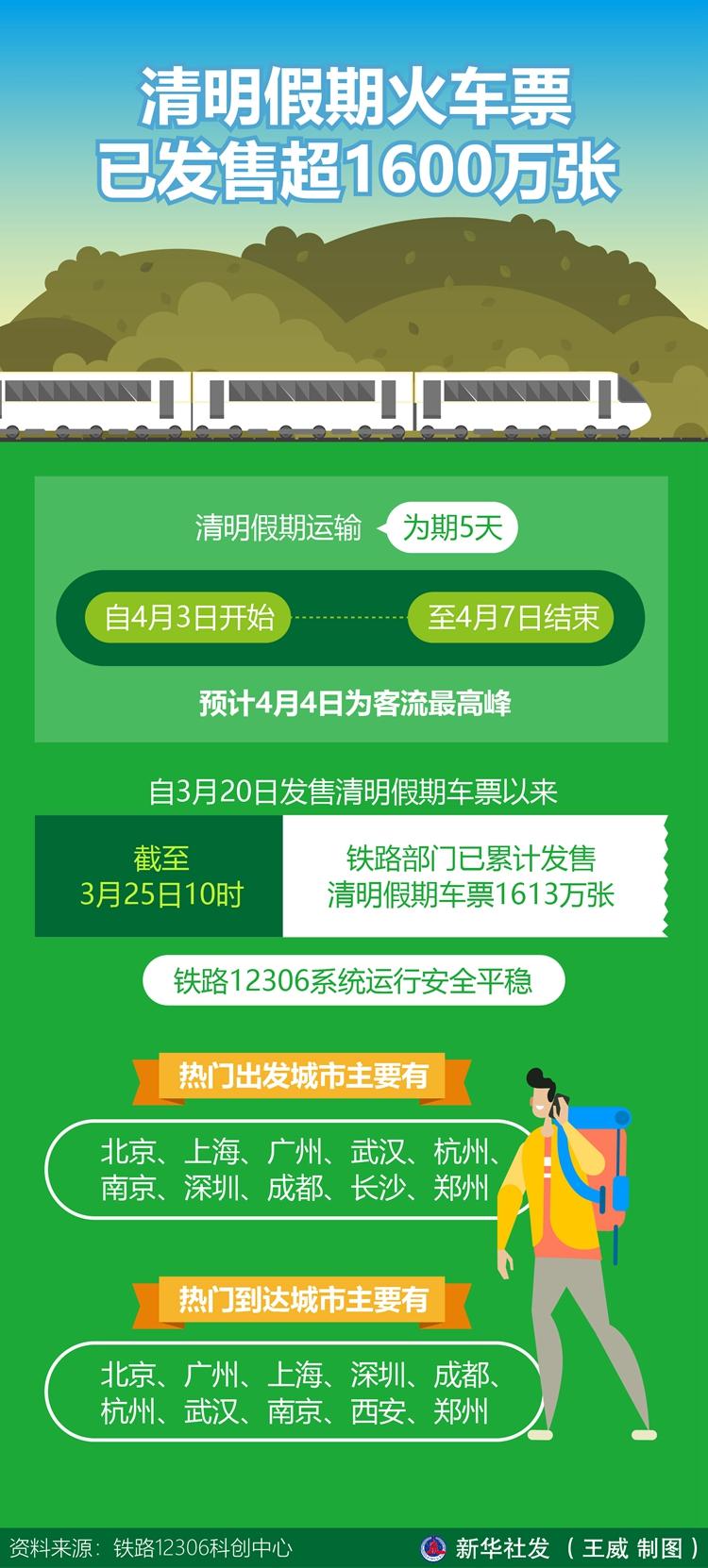 記者25日從鐵路12306科創(chuàng)中心獲悉,清明假期運(yùn)輸自4月3日開始,至4月7日結(jié)束,為期5天,預(yù)計(jì)4月4日為客流最高峰。自3月20日發(fā)售清明假期車票以來,截至3月25日10時(shí),鐵路部門已累計(jì)發(fā)售清明假期車票1613萬張,鐵路12306系統(tǒng)運(yùn)行安全平穩(wěn)。