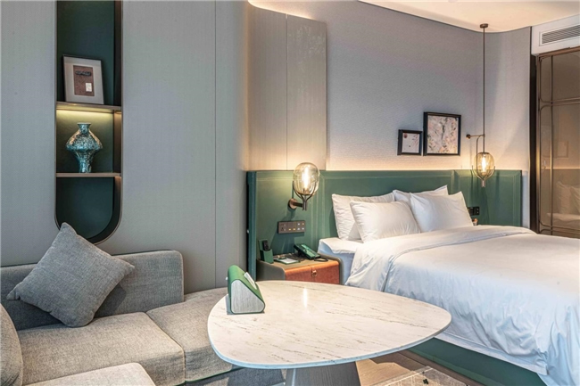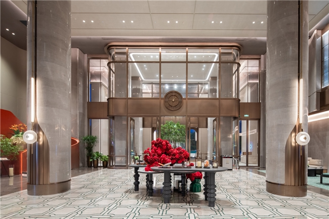 酒店由法國設(shè)計(jì)師Jave操刀設(shè)計(jì),以"楚韻新譯"為理念,巧妙融合現(xiàn)代奢華元素與荊楚文化傳統(tǒng)特色,打造出既具時(shí)代風(fēng)尚又飽含文化底蘊(yùn)的獨(dú)特空間。大堂主體采用大面積玻璃幕墻,搭配莫蘭迪紅綠配色點(diǎn)綴,白天,陽光透過玻璃傾灑,大堂內(nèi)溫馨明亮,宛如璀璨水晶宮殿;夜晚,借助精妙燈光設(shè)計(jì),呈現(xiàn)出迷人光影效果,成為城市夜色中耀眼的明珠。