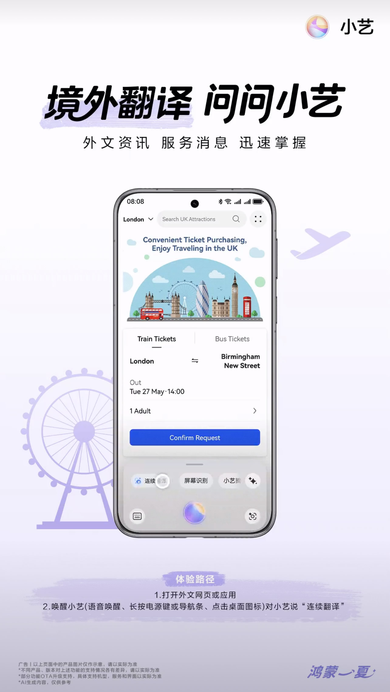 境外游時(shí),難免遇到瀏覽當(dāng)?shù)鼐W(wǎng)站訂票、打車時(shí)卻發(fā)現(xiàn)根本看不懂的麻煩。升級到鴻蒙 5.1的用戶這時(shí)就可以用小藝“連續(xù)翻譯”功能解決。長按小藝導(dǎo)航條,點(diǎn)擊“連續(xù)翻譯”服務(wù)即可體驗(yàn),一次開啟就能實(shí)現(xiàn)屏內(nèi)邊瀏覽邊翻譯的系統(tǒng)級連續(xù)翻譯體驗(yàn),支持截屏、文檔、瀏覽器等全場景的連續(xù)性翻譯。