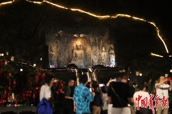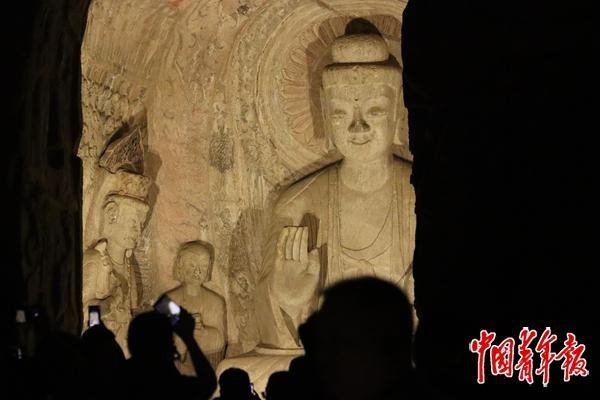 8月19日,河南洛陽(yáng),游客在夜色中參觀龍門石窟的賓陽(yáng)洞。中青報(bào)·中青網(wǎng)記者 余冰玥/攝