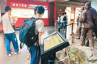 游客步入館內,仿佛踏入歷史的洪流。全息投影、文物陳列、場景復原等技術打造出數字化展陳空間。曾經只能在文字和圖片中描繪的歷史場景,如今栩栩如生地呈現在眼前。在秘密大營救展區(qū),雕塑還原文化名人在游擊隊員護送下離開的場景,當觀眾點擊多媒體互動裝置選擇不同的撤退路線時,大屏幕會動態(tài)還原當時驚險的轉移路徑,讓人如同身在其中,真切感受到革命先輩在槍林彈雨中的英勇機智。來自廣州的黃同學說:“有了這些多媒體設備,讓我更直觀了解到當時槍林彈雨的危險場景,也更好地學習了東江縱隊的歷史。”