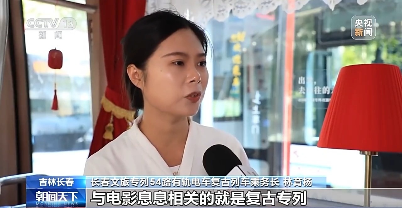 長春文旅專列54路有軌電車復古列車乘務(wù)長 林育楊:與電影息息相關(guān)的就是復古專列。它的起始站就是長影舊址博物館,途經(jīng)東風大街、創(chuàng)業(yè)大街、南陽路,都是熱播劇的取景地。
