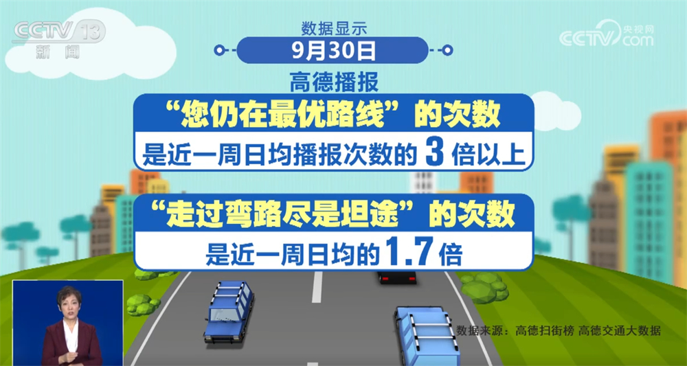 我們?cè)賮砜匆粋(gè)有趣的數(shù)據(jù)。“雖然前方擁堵,但您仍在最優(yōu)路線上”“今天走過了所有彎路,從此人生盡是坦途”,高德導(dǎo)航的“勸堵”金句與長(zhǎng)假出行實(shí)時(shí)相伴。數(shù)據(jù)顯示,9月30日,高德播報(bào)“您仍在最優(yōu)路線”的次數(shù)是近一周日均播報(bào)次數(shù)的3倍以上,播報(bào)“走過彎路盡是坦途”的次數(shù)是近一周日均的1.7倍,可見自駕出行的人越來越多。不過,也有重慶網(wǎng)友表示“扎心”,“走過彎路還是彎路,坦途這句等我開出重慶再說。”