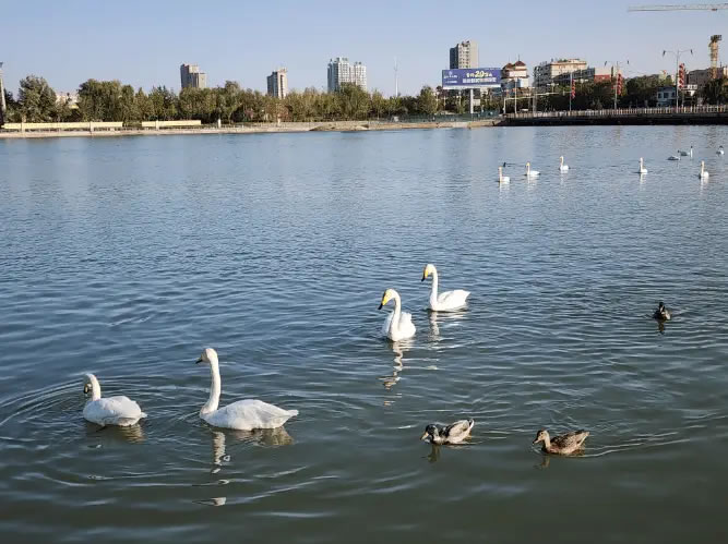 近日,一群野生白天鵝現(xiàn)身新疆庫爾勒市杜鵑河彭加木雕像附近水域。它們宛如久違歸家的“老友”,在水中歡快嬉戲,這也是今年首批來庫爾勒越冬的天鵝。天鵝如約而至,吸引了不少市民和游客駐足欣賞拍照,為梨城的秋天增添了一道迷人的風(fēng)景,也為節(jié)日增添了一份喜慶的氛圍。