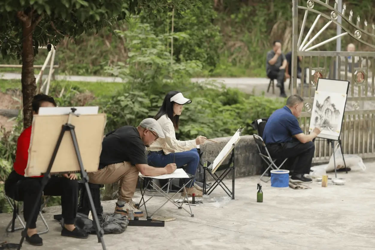 采風途中,藝術交流的氛圍格外濃厚。名家們時而圍站在一起,探討皴擦點染的技巧;時而各自凝神,將眼中的崀山轉(zhuǎn)化為筆下生動的線條與色塊。一幅幅即興創(chuàng)作的作品,在濃淡墨色的交融間,既展現(xiàn)了丹山碧水的壯闊,又傳遞了鄉(xiāng)村振興的蓬勃生機,讓崀山之美在宣紙絹素上綻放新韻。