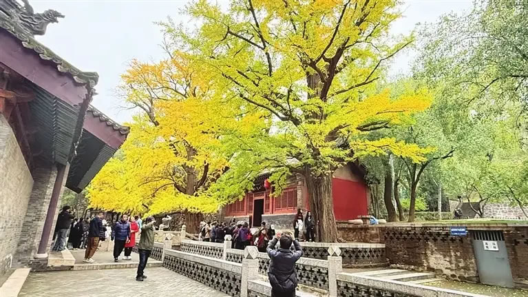 據(jù)工作人員介紹,這兩株枝干相依的古銀杏不僅是“資深網(wǎng)紅”,更是承載歷史的“活文物”。它們歷經(jīng)500年風(fēng)雨,至今枝繁葉茂,每年深秋都會如期換上“黃金盛裝”,與圣母殿、魚沼飛梁等著名古建筑共同構(gòu)成一幅動人的秋日畫卷。