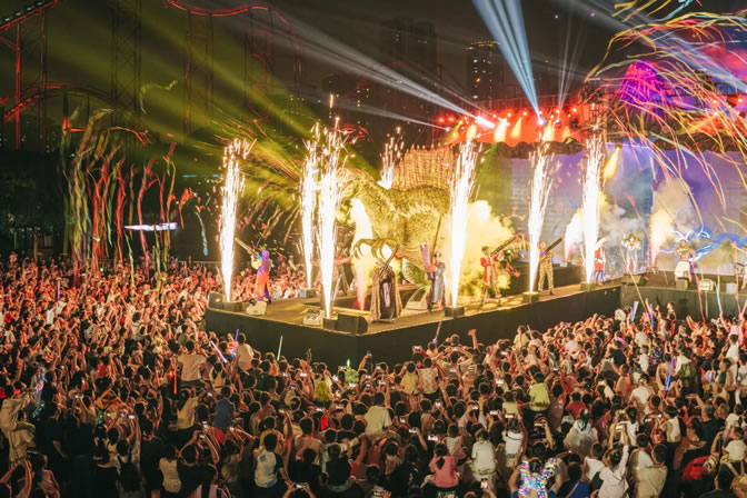 不僅有奇幻新世界,更有奇趣新體驗(yàn)。劇場里,《復(fù)活恐龍D計(jì)劃》魔法秀展現(xiàn)恐龍主題趣味魔法,《魯樂回家》音樂劇傳遞人與自然之間的溫暖,《恐龍島危機(jī)》特技表演詮釋冒險(xiǎn)旅途的驚險(xiǎn)刺激;項(xiàng)目前,“百龍軍團(tuán)”“角角見面會(huì)”“邂逅侏羅紀(jì)”等仿真恐龍的快閃互動(dòng)實(shí)現(xiàn)了游客“與龍同行”的震撼奇觀;巡游中,“怪獸天團(tuán)”“逗趣南瓜團(tuán)”“鬼馬精靈”花車巡游從日落到夜幕,一路載歌載舞,在全新“奇幻D秀”結(jié)合電音派對點(diǎn)亮夜空與舞臺(tái),為大小游客留下難忘的假日歡樂。