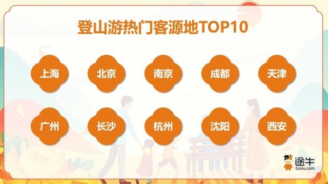 《報(bào)告》數(shù)據(jù)顯示,二線及以上城市用戶是登山游的主力軍,在今年途牛登山游用戶中的出游人次占比超過了70%。其中,上海、北京、南京、成都、天津、廣州、長(zhǎng)沙、杭州、沈陽、西安等是排名靠前的客源地城市。