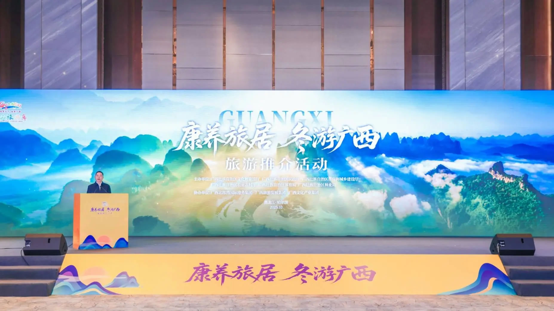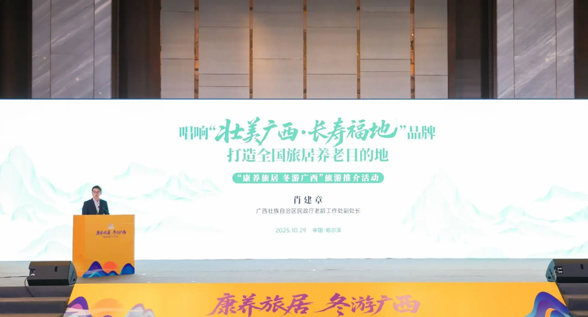 10月28日-29日,由廣西壯族自治區(qū)文化和旅游廳、民政廳、住房城鄉(xiāng)建設(shè)廳、農(nóng)業(yè)農(nóng)村廳、體育局、林業(yè)局共同主辦的“康養(yǎng)旅居 冬游廣西”旅游推介活動在哈爾濱市舉辦。