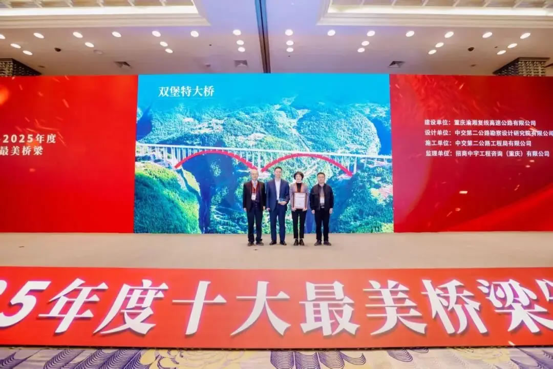 近日,由《橋梁》雜志社組織舉辦的“2020-2025年度十大最美橋梁”終評會議及頒獎晚會舉行,其中,渝湘復線高速公路雙堡特大橋獲評“2020-2025年度十大最美橋梁”。