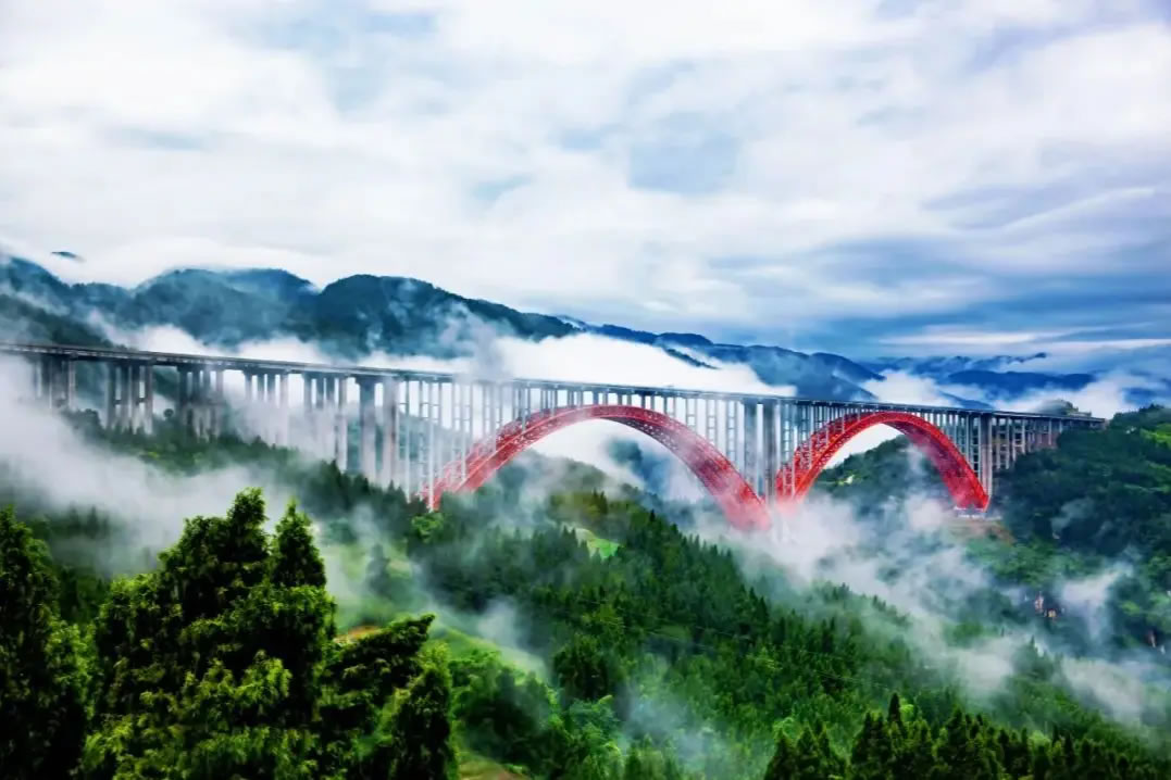 雙堡特大橋以橋與自然和諧共生之美擁抱大地、致敬自然,展示了橋梁設計的結構藝術,樹立了創(chuàng)新典范,為推動山區(qū)橋梁工程藝術的創(chuàng)新與發(fā)展貢獻重慶力量。 (來源:重慶高速集團)