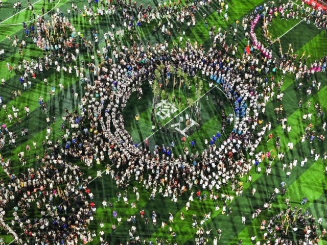 8月23日,人們在貴州“村超”球場跳苗族蘆笙舞(無人機(jī)照片)。新華社記者楊文斌 攝