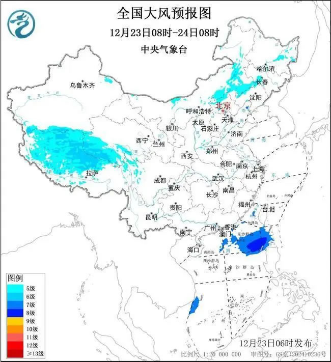 預計,12月23日08時至24日8時,內蒙古中東部、華北北部、黑龍江中東部、吉林西部、遼寧北部及遼東半島、新疆北疆東部及南疆盆地山區(qū)、青海南部、西藏中北部等地有5~6級風,陣風7~8級;巴士海峽、南海東北部將有7~8級、陣風9級的大風,渤海東北部局地海域將有7級、陣風8級的大風。