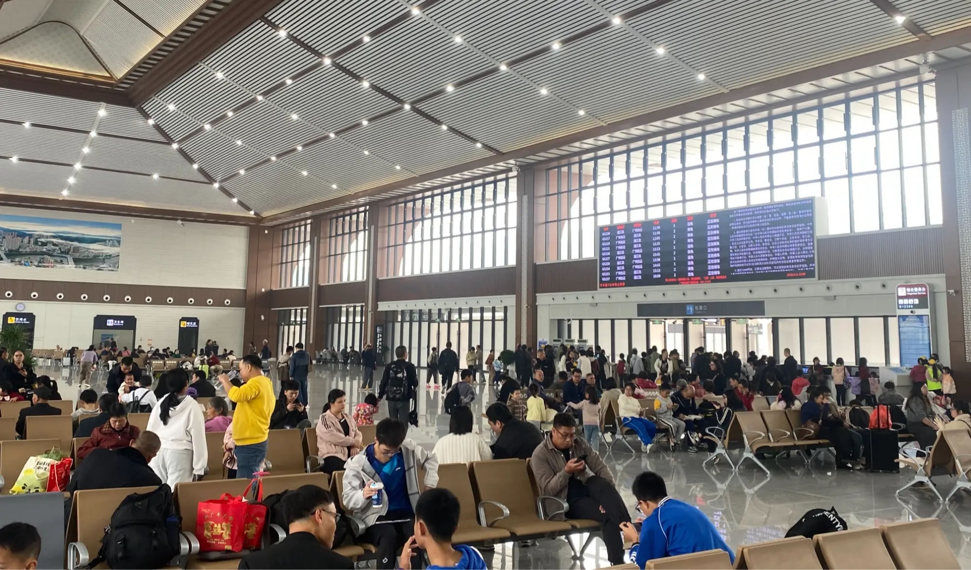上午的候車(chē)大廳內(nèi),客流較平日明顯增多。旅客在志愿者和工作人員的引導(dǎo)下有序候車(chē),安檢口雖排起隊(duì)伍,但通行速度較快,廣播循環(huán)播放著安全提示和車(chē)次信息,整體氛圍忙而不亂。