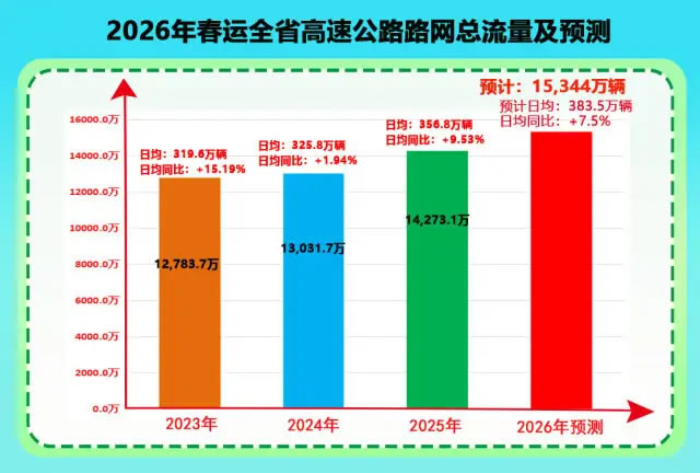 2026年春運將于2月2日開始,3月13日結束,共計40天。春節(jié)假期小型客車免費通行時間為2月15日至2月23日。省高速公路路網(wǎng)運行監(jiān)測指揮中心研判,春運40天全省高速公路出入口總流量將達到15344萬輛,較2025年春運增長7.5%;日均流量383.5萬輛,為平日流量的1.6倍,車流總量有望創(chuàng)歷史新高。