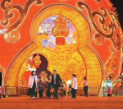 敘事主題的豐富,讓彩燈成為講述中國(guó)故事的載體。180米長(zhǎng)的《木蘭傳奇》燈組步道上,花木蘭的颯爽英姿與家國(guó)大義徐徐鋪展,傳統(tǒng)人物的精神內(nèi)核在現(xiàn)代光影技藝演繹下直抵人心。抬眼望去,全長(zhǎng)210米、高達(dá)32米的鯤鵬燈組震撼全場(chǎng),“鯤鵬展翅”的視覺奇觀與當(dāng)代載人航天、深潛等場(chǎng)景光影交融。福祿廣場(chǎng),藻井如蓮花般旋轉(zhuǎn),光影“福”字“從天而降”落入游客掌心,讓“伸手接福”從“吉祥話”變成可觸碰的溫暖記憶。