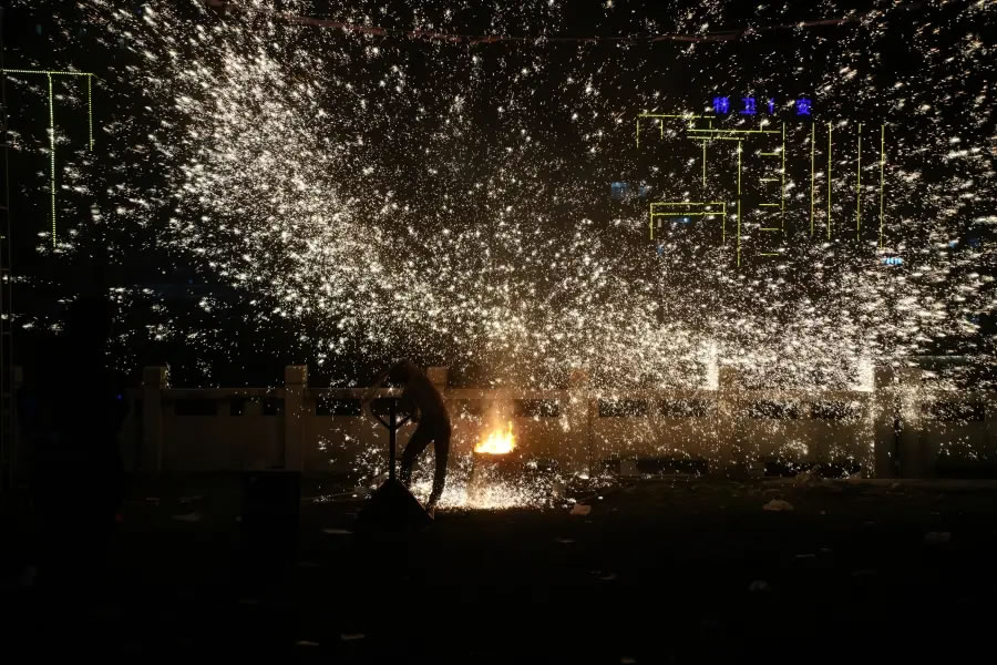 夜幕降臨,非遺打鐵花表演率先登場。匠人們將滾燙的鐵水奮力擊打,萬千金花在夜空綻放,形成“火樹銀花不夜天”的壯觀景象。這門千年技藝承載著人們對風調雨順、國泰民安的美好祈愿。
