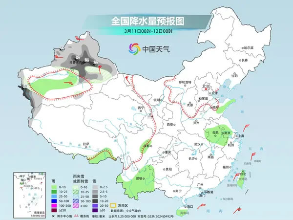 明天,新疆北疆和南疆西部山區(qū)等地部分地區(qū)有小到中雪或雨夾雪,其中,新疆沿天山地區(qū)和南疆西部山區(qū)等地部分地區(qū)有大到暴雪,局地大暴雪。新疆南疆盆地、西藏東南部、山東半島、安徽大部、江蘇南部、云南大部、海南島中南部、臺(tái)灣島等地部分地區(qū)有小雨。