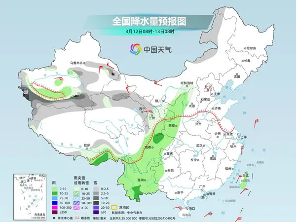 后天,內(nèi)蒙古東北部和中部、新疆沿天山地區(qū)和南疆山區(qū)、西藏西部和南部、甘肅大部、青海北部和東部等地部分地區(qū)有小到中雪或雨夾雪,其中,新疆東部和南疆山區(qū)等地部分地區(qū)有大到暴雪。新疆南疆盆地、西藏東南部、川西高原東部、陜西、四川盆地中西部、貴州西部、云南、臺(tái)灣島等地部分地區(qū)有小雨,局地有中雨。