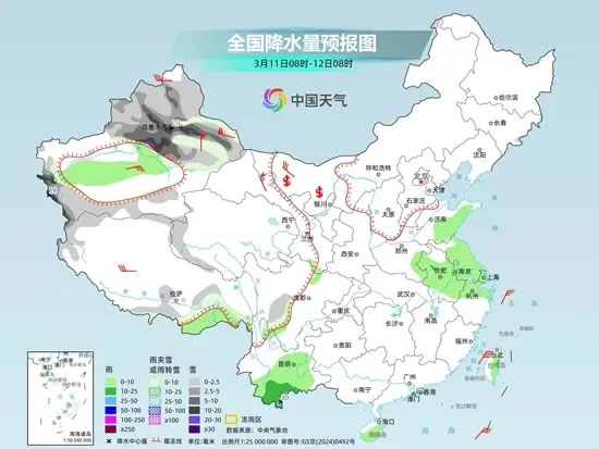 具體來看,中央氣象臺(tái)預(yù)計(jì),今天新疆北部和南疆山區(qū)、西藏西北部和東部等地部分地區(qū)有小到中雪或雨夾雪,其中,新疆沿天山地區(qū)和南疆西部山區(qū)等地部分地區(qū)有大到暴雪,局地大暴雪。新疆南疆盆地、西藏東南部、山東中東部、蘇皖大部、浙江北部、云南中東部、海南島等地部分地區(qū)有小到中雨,其中,云南西南部等地部分地區(qū)有大雨。