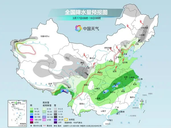 今起三天,南方仍多陰雨,西南地區(qū)東部、江淮、江南西部和北部以穩(wěn)定性降水為主,會有春雨綿綿的感覺。中央氣象臺預(yù)計,今天,新疆南部、西藏大部、青海大部、甘肅南部、寧夏南部、川西高原西部和北部等地部分地區(qū)有小到中雪或雨夾雪,其中,新疆西南部、西藏東北部和南部、青海東部、甘肅南部等地部分地區(qū)有大到暴雪。西藏東南部、湖北東部和中南部、安徽南部、湖南北部、江西西北部、重慶東南部、貴州南部和東北部、云南西北部等地部分地區(qū)有中到大雨,其中,西藏東南部等地局地有暴雨。
