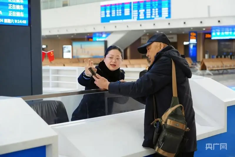 廈門北站“海峽情·小白鷺”服務(wù)臺(tái)工作人員為旅客答疑解惑。(央廣網(wǎng)發(fā) 安昕宇攝)