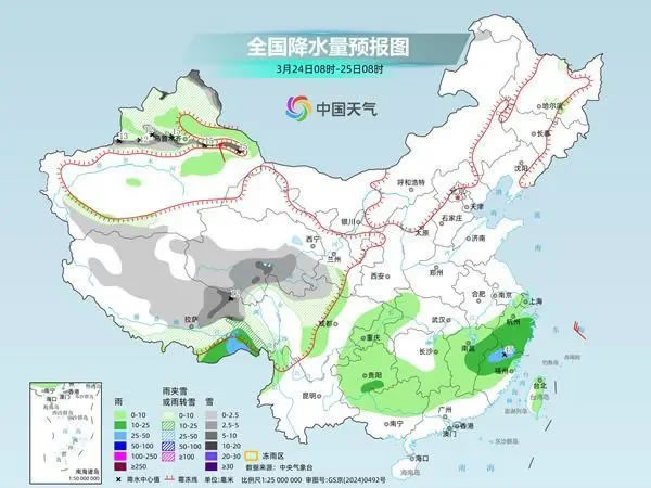 具體來(lái)看,中央氣象臺(tái)預(yù)計(jì),今天,新疆北疆北部和沿天山地區(qū)、西藏北部和東部、青海東部和南部、川西高原中北部等地部分地區(qū)有小到中雪或雨夾雪,其中,新疆北疆阿勒泰山區(qū)和沿天山地區(qū)、西藏東北部、青海東南部等地部分地區(qū)有大到暴雪。江漢西部、江南大部、西南地區(qū)東部、華南北部、臺(tái)灣島東部等地部分地區(qū)有小到中雨,其中,浙江南部、福建北部等地部分地區(qū)有大雨。