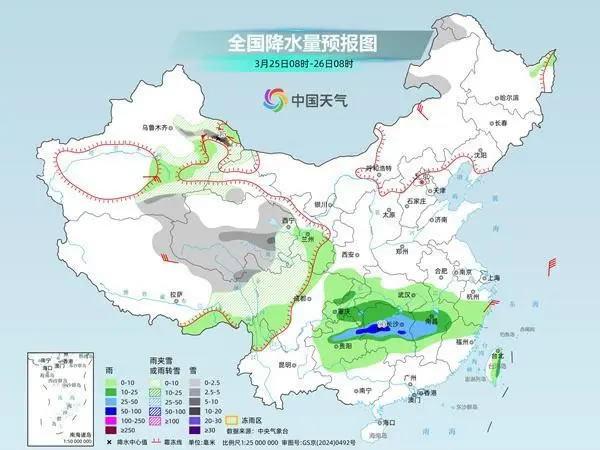 未來(lái)三天,南方大范圍陰雨天氣持續(xù),降水強(qiáng)度總體有所減弱,湖南、江西、福建等地部分地區(qū)有大雨或暴雨。此外,青藏高原、新疆部分地區(qū)今明天降雪將增多、增強(qiáng),部分地區(qū)有大到暴雪。